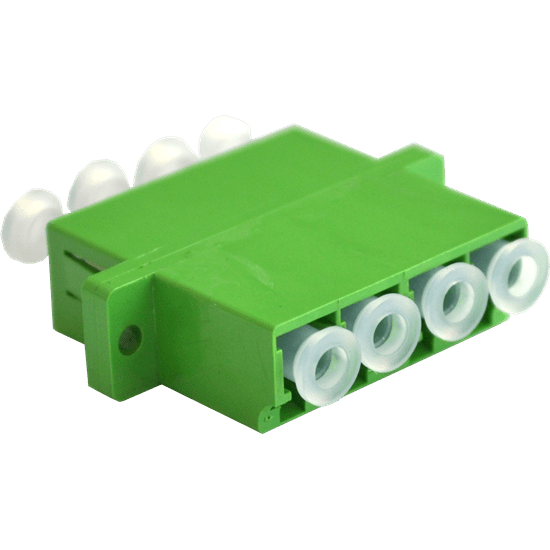 The Single Mode Fibre Optical OS2 Quadplex Adaptor/Coupler LC/APC Female to Female in green with a flange is designed to provide a reliable and efficient connection for single-mode fibre optic cables. It serves as a termination or linking device, ensuring minimal loss during light transmission.